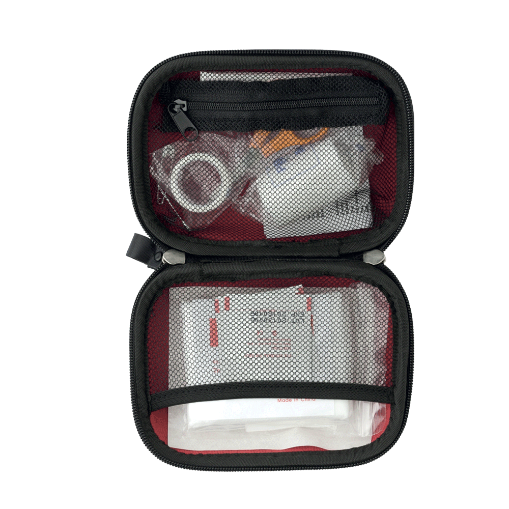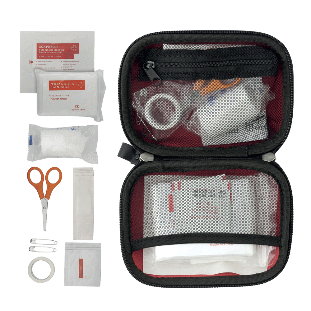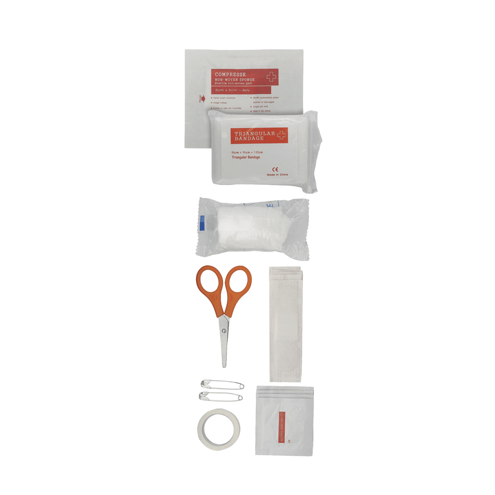 CONTIENE: forbici, 4 tamponi/alcol, 5 cerotti sterili, nastro sanitario, 1 rotolo di garza, 1 bendaggio triangolare, 2 spillette, 1 tampone sterile