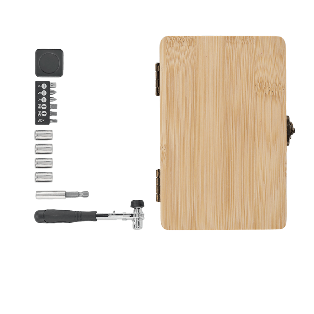 – 13 funzioni di utilità: punte per cacciaviti, chiavi a bussola, adattatore, connettore e flessometro