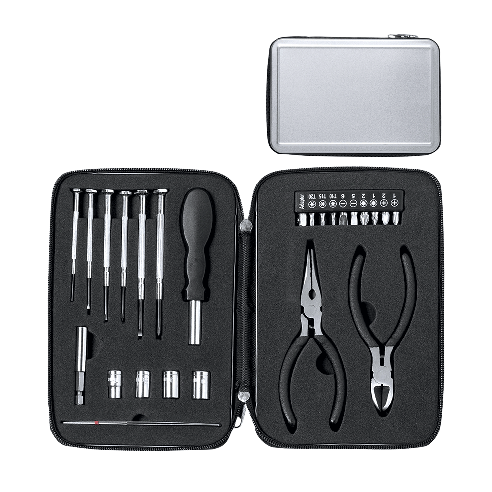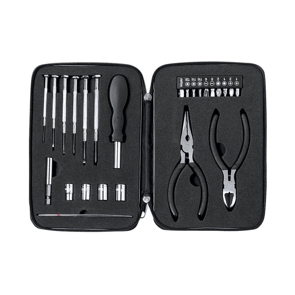 – pinza, cacciaviti a croce e piatti, tronchesina, manicotto multifunzione, kit punte con varie misure intercambiabili, etc.