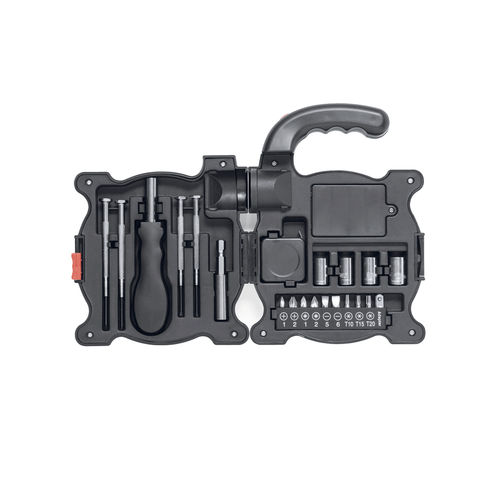 Contiene: cacciaviti piatti e a croce, manico multifunzione e adattatore, chiavi a bussola, flessometro